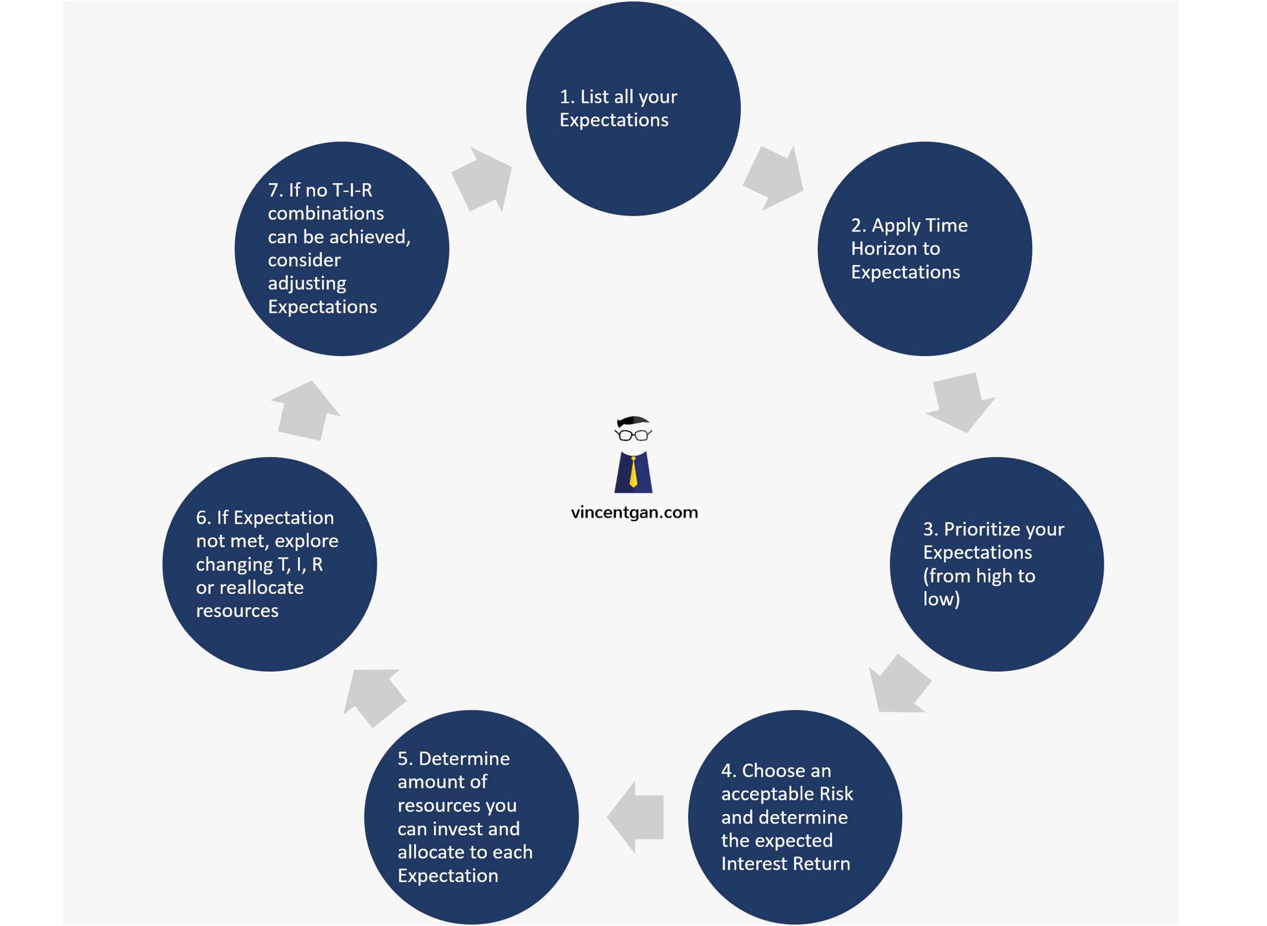 If you have a financial advisor, he or she can help you with this process, especially with steps 4-6, and particularly if you have many Expectations to balance. Revisit your RITE regularly as they can change over time. For example, your time horizon inevitably becomes shorter and you will need to adjust your risk and return profile for your portfolio.